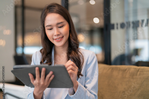 smart confidence asian female startup entrepreneur small business owner businesswoman wear smart casual cloth smile hand use tablet woking inventory checking in showroom office daytime background