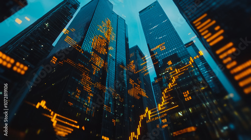 Smart digital Innovation Business skyscrapers in the Financial District with connection network reciprocity over the cityscape. of future smart wireless digital city and social media networking