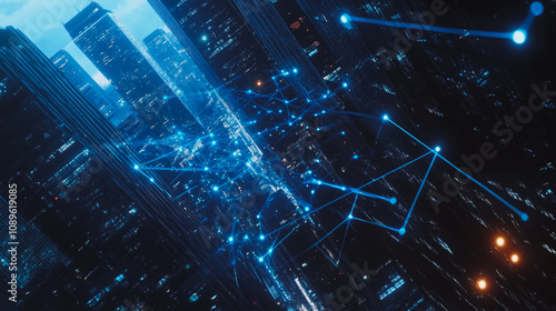 Smart digital Innovation Business skyscrapers in the Financial District with connection network reciprocity over the cityscape. of future smart wireless digital city and social media networking