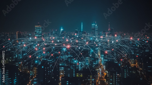 Smart digital Innovation city with connection network reciprocity over the cityscape. of future smart wireless city and social media networking systems that connects business people with in city