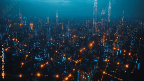 Smart digital Innovation city with connection network reciprocity over the cityscape. of future smart wireless city and social media networking systems that connects business people with in city