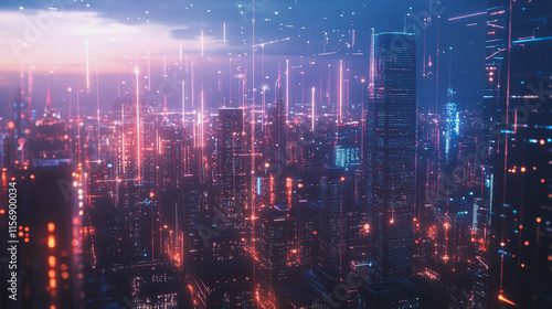 Smart digital Innovation city with connection network reciprocity over the cityscape. of future smart wireless city and social media networking systems that connects business people with in city