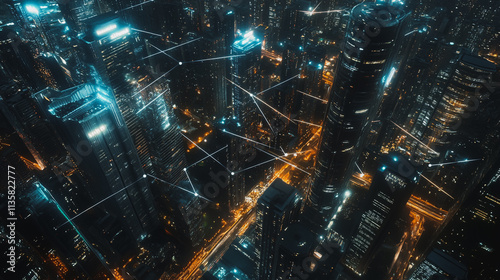 Smart digital Innovation city with connection network reciprocity over the cityscape. of future smart wireless digital city and social media networking systems that connects people with in city