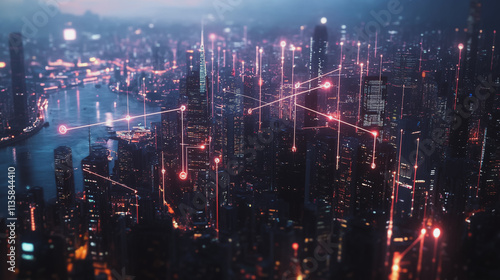 Smart digital Innovation city with connection network reciprocity over the cityscape. of future smart wireless digital city and social media networking systems that connects people with in city