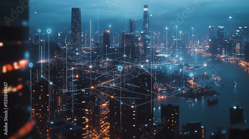 Smart digital Innovation city with connection network reciprocity over the cityscape. of future smart wireless digital city and social media networking systems that connects people with in city