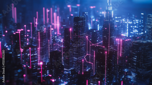 Smart digital Innovation city with connection network reciprocity over the cityscape. of future smart wireless digital city and social media networking systems that connects people with in city