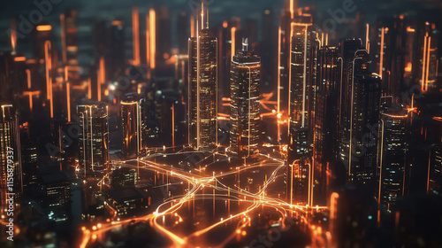 Smart digital Innovation city with connection network reciprocity over the cityscape. of future smart wireless digital city and social media networking systems that connects people with in city