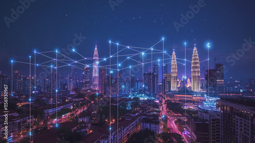 Smart digital Innovation city with connection network reciprocity over the cityscape. of future smart wireless digital city and social media networking systems that connects people with in city