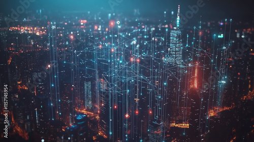 Smart digital Innovation city with connection network reciprocity over the cityscape. of future smart wireless digital city and social media networking systems that connects people with in city