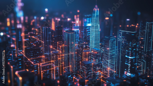 Smart digital Innovation city with connection network reciprocity over the cityscape. of future smart wireless digital city and social media networking systems that connects people with in city