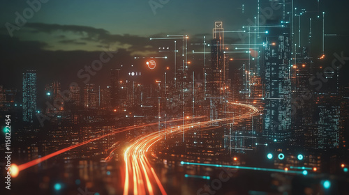 Smart digital Innovation city with connection network reciprocity over the cityscape. of future smart wireless digital city and social media networking systems that connects people with in city