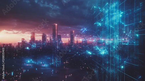 Smart digital Innovation city with connection network reciprocity over the cityscape. of future smart wireless digital city and social media networking systems that connects people with in city
