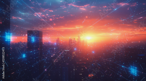 Smart digital Innovation city with connection network reciprocity over the cityscape. of future smart wireless digital city and social media networking systems that connects people with in city