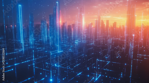 Smart digital Innovation city with connection network reciprocity over the cityscape. of future smart wireless digital city and social media networking systems that connects people with in city
