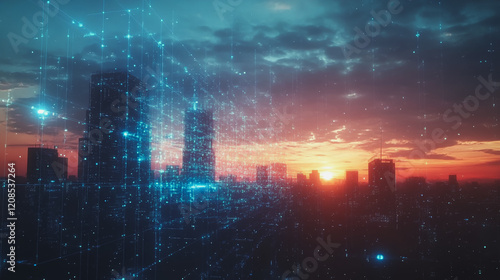 Smart digital Innovation city with connection network reciprocity over the cityscape. of future smart wireless digital city and social media networking systems that connects people with in city