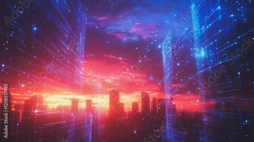 Smart digital Innovation city with connection network reciprocity over the cityscape. of future smart wireless digital city and social media networking systems that connects people with in city