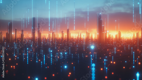 Smart digital Innovation city with connection network reciprocity over the cityscape. of future smart wireless digital city and social media networking systems that connects people with in city