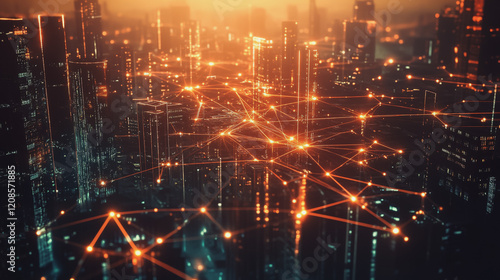 Smart digital Innovation city with connection network reciprocity over the cityscape. of future smart wireless digital city and social media networking systems that connects people with in city