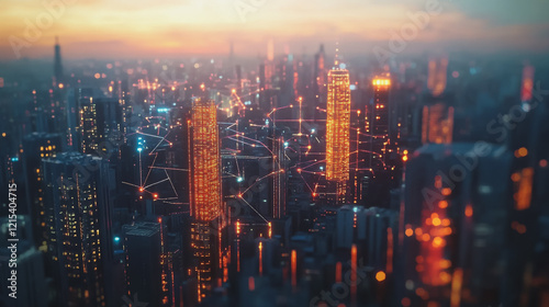 Smart digital Innovation city with connection network reciprocity over the twilight cityscape. of future smart wireless digital city and social media networking systems that connects people with city