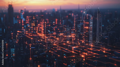 Smart digital Innovation city with connection network reciprocity over the twilight cityscape. of future smart wireless digital city and social media networking systems that connects people with city