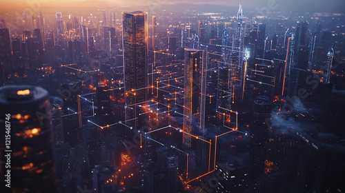 Smart digital Innovation city with connection network reciprocity over the twilight cityscape. of future smart wireless digital city and social media networking systems that connects people with city