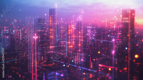 Smart digital Innovation city with connection network reciprocity over the twilight cityscape. of future smart wireless digital city and social media networking systems that connects people with city