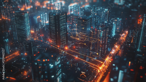 Smart digital Innovation city with connection network reciprocity over the twilight cityscape. of future smart wireless digital city and social media networking systems that connects people with city
