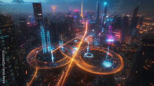 Smart digital Innovation city with connection network reciprocity over the twilight cityscape. of future smart wireless digital city and social media networking systems that connects people with city