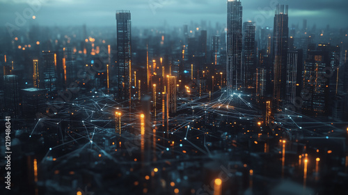 Smart digital Innovation city with connection network reciprocity over the twilight cityscape. of future smart wireless digital city and social media networking systems that connects people with city