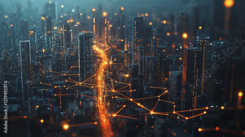 Smart digital Innovation city with connection network reciprocity over the twilight cityscape. of future smart wireless digital city and social media networking systems that connects people with city