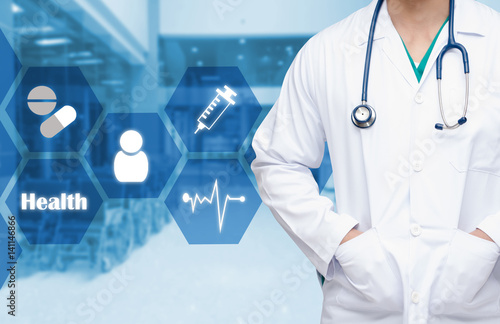 smart doctor with a stethoscope around his neck with health care icons and hexagonal shaped pattern on the hospital blurred background, medical technology concept.