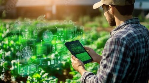 Smart farm concept with a young man controlling AI technology, using a tablet to monitor crops and agricultural equipment