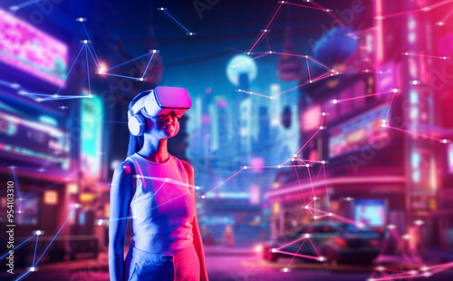female, virtual, reality, ar, gamer, technology, ai, neon, artificial intelligence, meta, game, gaming, headset, digital, futuristic, online, cyberspace, connect, tech, community, future, contraption, entertainment, entertain, science, connection, global, globalize, vector, communication, worldwide, network, networking, abstract, light, enjoy, cyber, play, racked, standing, fantasy, wonder, marvellously, building