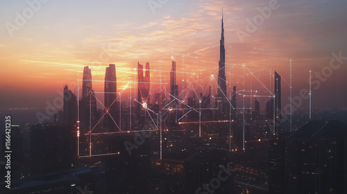 Smart Innovation city with connection cyber security network reciprocity over the sunset cityscape future wireless digital city and social media networking systems that connects people in the city