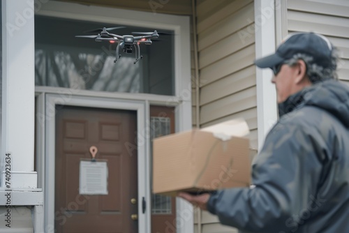 Smart package Drone Delivery freight carrier. Box shipping herding drone parcel drone delivery safety transportation. Logistic tech snack box mobility urbanization architecture