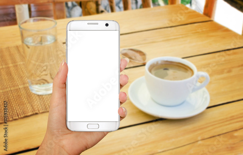 Smart phone with isolated display for mockup in hand. Relax time with coffee on table.