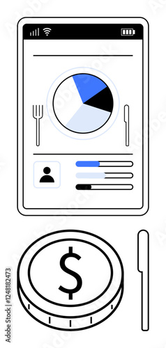 Smartphone interface displaying pie chart, utensils, and user metrics, paired with a dollar coin icon and fork. Ideal for finance, budgeting, diet tracking, nutrition, apps user insights abstract