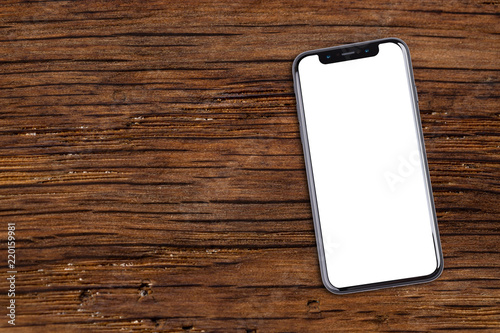 Smartphone lies on a wooden table. Isolated white screen with copy space.