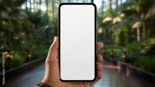 Smartphone mockup held in hand with green botanical garden background. Digital outdoors template device advertising image. Technology concept cellphone photorealistic product mock up