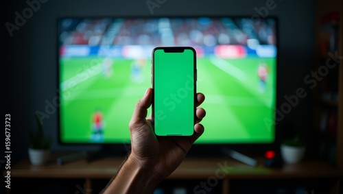 Smartphone with Green Screen in Front of a Television Showing a Soccer Match