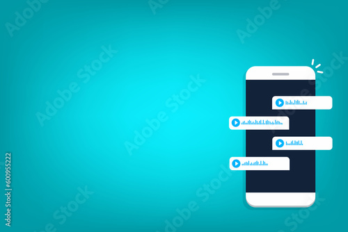 Smartphone with voice messages on screen. Voice and audio messages. Modern communication in messenger. Online chat. Social media concept. Mobile phone with chat app and voice messages bubbles.