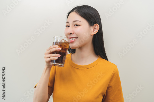 Smile happy thirsty asian young woman, girl drink or sip, holding glass of cold sparkling soda, cola water with ice, refreshness people, isolated on background. Temptation of food and beverage concept