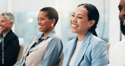 Smile, laughing a business woman in a meeting with her colleagues for training in a workshop or seminar. Corporate, conference or education with a happy employee in the boardroom of an office