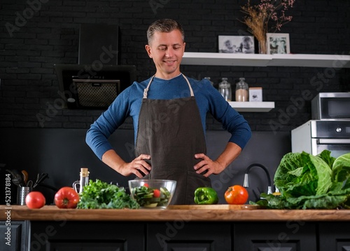 Smiling man cooking salad, cutting fresh vegetables in modern black kitchen, happy satisfied male preparing vegetarian food for dinner. Cabbage, tomatoes, zucchini, pepper on the back.