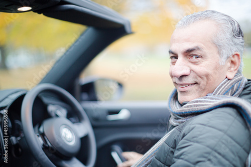 smile, affection, senior, man, car, active, adult, autumn, bonding, carefree, caucasian, connection, day, enjoy, front view, grey, hair, happy, head shot, lean, lifestyle, middle eastern, outdoors, park, people, public, retirement, well-being