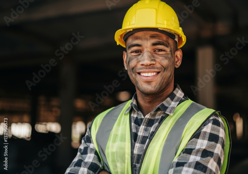 Smiling African American construction worker in hard hat and reflective vest at building site