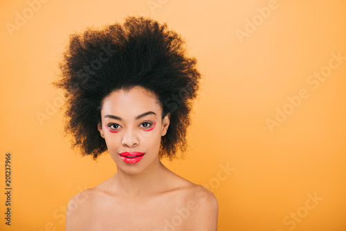 red, yellow, colourful, vibrant, coloured, beautiful, happy, person, girl, female, young, smiling, people, beauty, happiness, portrait, smile, youth, creativity, fashion, creative, emotional, make-up, alone, attractive, lip, lipstick, fashionable, afro, copy space, studio shot, black woman, african american, curly hair, mixed race