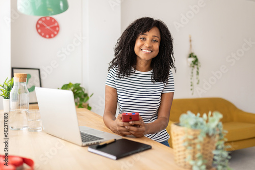 Smiling african american woman with curly hairstyle holding mobile phone while working on laptop computer at home. Technology, business and home office concept.