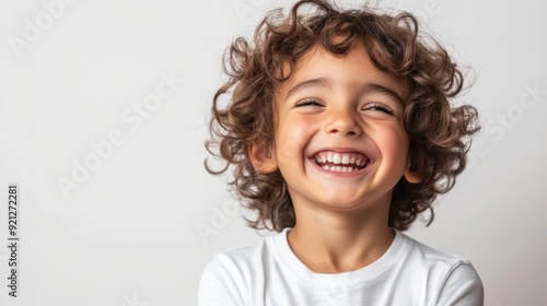 Smiling and laughing child with curly hair in a white shirt, looking up. Perfect for familythemed designs and childrens products advertising.