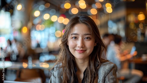 Smiling Asian businesswoman on a laptop at a vibrant coffee shop
